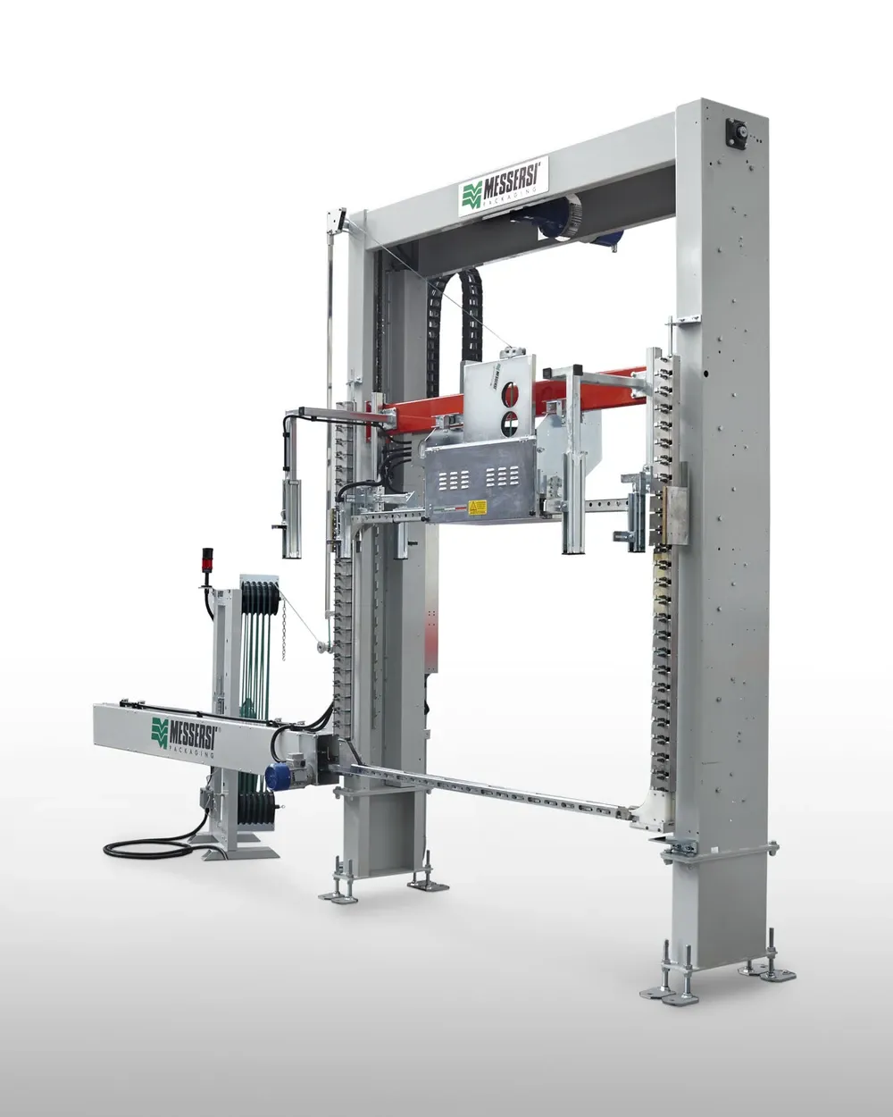 A cintadora automática horizontal, equipada com cabeçote MS300 de alto desempenho, é a solução ideal para a cintagem horizontal de produtos paletizados de qualquer tipo e dimensão. O sistema de funcionamento, com avanço do cabeçote e movimento da guia da cinta, permite compactar a carga nos quatro lados.